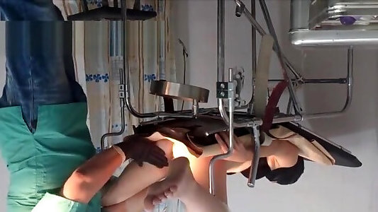 damsel in a ebony mask. check-up in obgyn stool