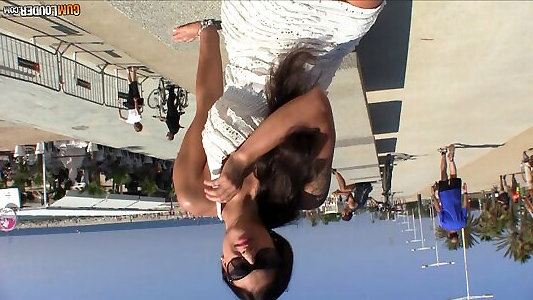 Beach bunny flashes her udders then finishes off all over his hard-on